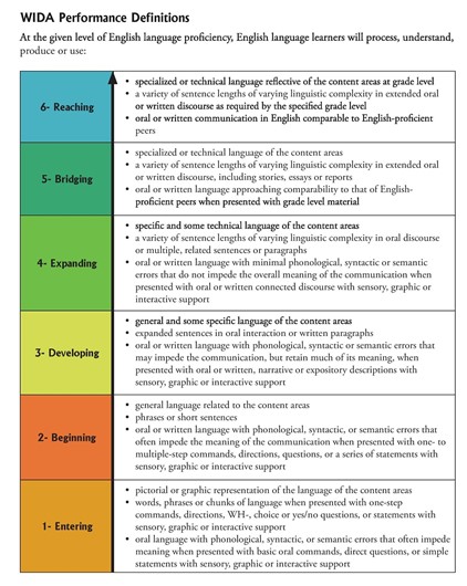 All students who are eligible for EL services will take the WIDA ACCESS for ELs each year. Scores are reported on a 6-point scale. In Vermont, if the student scores below a level 5 overall proficiency level, the student continues to be eligible for services.